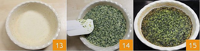 then add the grated Parmesan and grated Emmental 10 and beat again. At this point, add the spinach to the egg and cheese mixture 11, mix everything well 12.