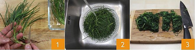 To prepare the omelette with monk's beard, start by cleaning the monk's beard: remove the reddish end 1 and wash the monk's beard carefully under running water 2, then boil it in a pot with salted water for about ten minutes. Drain it well, place it on a cutting board, and cut it into rough pieces 3, leaving the strands still quite long.