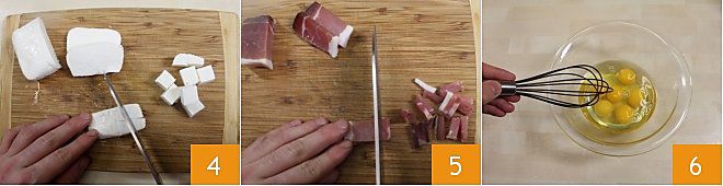 Cut the primosale into not too small cubes 4 and the speck into strips 5. In a bowl, beat the eggs 6.