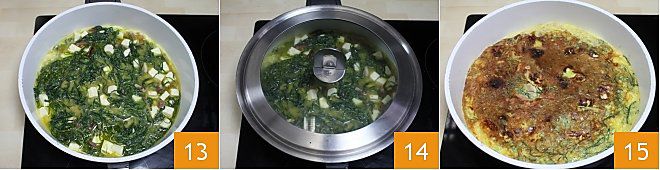 when it's hot, pour in the mixture 13 and cover with a lid 14. Cook for about ten minutes over medium-low heat and then, using the lid, flip the omelette, turning it over and letting it slide back into the pan. Let it cook for another 5 minutes on the other side without the lid 15. The omelette with monk's beard is ready; you can serve it as a main course or cut it into cubes if the omelette with monk's beard will be used to enrich a buffet appetizer.