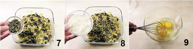 the capers 7, and Parmesan cheese 8. Mix all the ingredients well and start preparing the batter: beat the eggs 9
