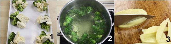 To prepare the mixed fried vegetables and cheeses, start by preparing the vegetables: clean and cut the cauliflower and broccoli into small pieces 1, cook the broccoli in boiling water for 3 minutes 2 and the cauliflower for 5 minutes; they should remain crunchy. Slice the potatoes thinly 3 and cook them for 1 minute in salted boiling water.