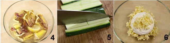 Now clean the artichokes following the instructions you can How to clean artichokes, cut them into quarters and place them in a bowl with lemon water to prevent them from turning brown 4. Wash the zucchini and slice them thinly 5. At this point, prepare the cheeses: in a large bowl, place the ricotta, finely sliced caciotta slices, and 2 tablespoons of grated provolone, flour, salt, pepper, and nutmeg 6