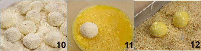 and mix everything 7 to form balls of about 0.5 oz each 8. Finally, slice the remaining provolone 9. Prepare the ingredients for breading: in a bowl, beat the egg yolks with salt, and place flour and breadcrumbs on two large trays.