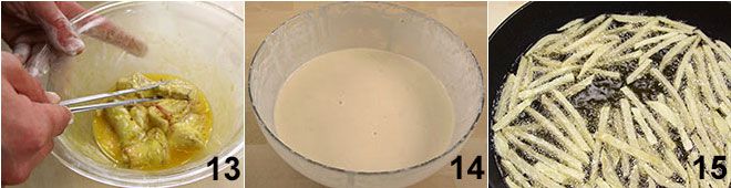 Continue similarly with half of the artichokes 13. Now prepare the batter: in a bowl, pour the water and gradually add the flour, mixing with a whisk to avoid lumps 14, let the batter rest in the refrigerator for about half an hour. Everything is ready for frying: place a large pan with plenty of vegetable oil on the stove, as soon as the oil is hot, start frying the potatoes first 15 and then let them dry on absorbent paper.