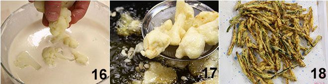Dip the cauliflower bites 16, broccoli, zucchini, and the remaining artichokes in the batter, fry them 17, and let them dry. Finish frying with the breaded cheeses and artichokes. Make sure to dry all the vegetables and cheeses on a sheet of absorbent paper to remove excess oil 18. Serve the hot and crispy fried vegetables and cheeses immediately!
