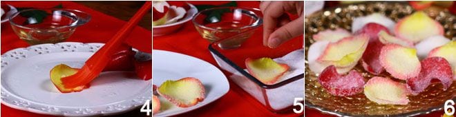 Crack an egg and separate the yolk from the white: place the latter in a small bowl. Pour some granulated sugar into another small bowl. Take one petal at a time, and with a kitchen brush, gently and entirely brush it with the egg white 4 and then coat it in the granulated sugar 5. Place all the petals obtained this way on a tray, without overlapping them, and let them dry until they become stiff 6. Once dry, you can use your frosted petals to decorate cakes, cupcakes, ice cream, creams, mousses, fruit salads, etc.…