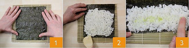 To prepare futomaki, place a whole sheet of nori seaweed on the bamboo mat 1 (if you prefer, you can cover it with plastic wrap), with the smooth and shiny side facing down. Wet your hands in a bowl with water, possibly acidulated with a few tablespoons of rice vinegar, and take about 100 grams (3.5 oz) of sushi rice. Wetting your hands is necessary because the rice is very sticky, preventing it from sticking to your hands. Spread the rice over the surface of the seaweed (you can use a wooden spatula to help), leaving a couple of centimeters (0.75 in) of seaweed free on the top edge 2. The thickness of the rice should not be too high. If you like, you can take a small amount of wasabi and spread it in the center on the rice, not too much because wasabi is spicy 3. If you don't like wasabi, you can skip this step.