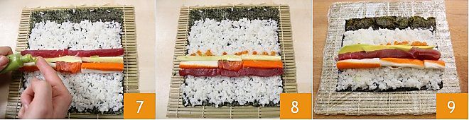 Take about a tablespoon of fish roe 4 and place it in the center of the rice 5, then arrange the sticks of various ingredients in any way you like 6, remembering that futomaki requires at least 4 ingredients inside.