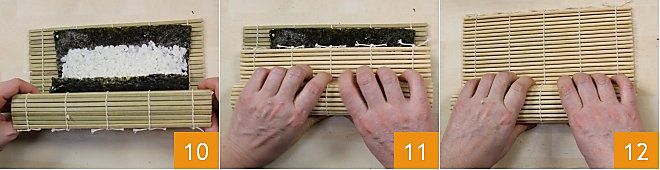 Now take the lower edge of the mat 8 and, pressing the central ingredient inward with your fingers, roll everything up like a spring roll. Keep gentle pressure on the roll to keep it compact until you see the strip of seaweed not covered by rice 9; then move the roll a little forward so that the uncovered strip of nori seals everything: the moisture of the rice will act as an adhesive. At this point, shape the roll, pressing uniformly with your hands along the length 10.