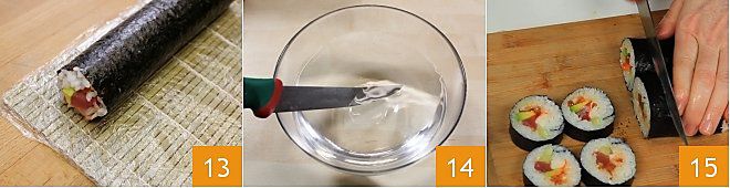 Here is the futomaki ready 11: push inward the protruding rice grains on the sides. Now, cut the futomaki: place it on a cutting board and wet the knife blade with acidulated water 14; cut it in half, place the two obtained pieces side by side, then cut them into six equal parts 15, so you will get 12 pieces of futomaki.