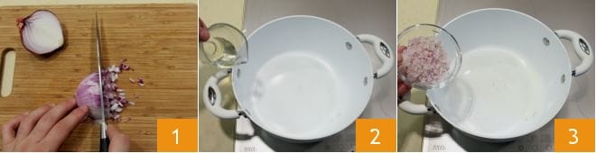 To prepare gallo pinto, start by cleaning and finely chopping the onion 1. Pour the vegetable oil into a large pan (set aside a teaspoon) 2, then add the chopped onion 3.