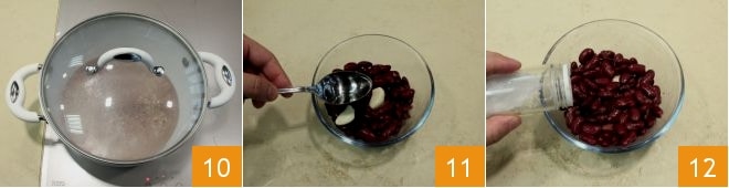Cover and let it cook over very low heat for at least 15-20 minutes 10. In a small bowl, season the beans with garlic, a teaspoon of vegetable oil, and salt (11-12).