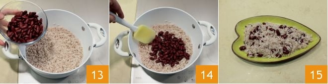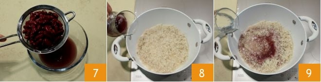 then drain the red beans from their preserving liquid 7 and add 4.4 oz to the rice 8, along with the remaining water 9.