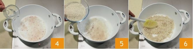 Add half of the water 4 and let the onion soften over low heat. Then toast the rice for a few minutes (5-6),