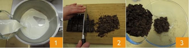 To prepare the ganache cream, as a first step, pour the cream into a saucepan 1 and bring it to a simmer. Meanwhile, finely chop the chocolate 2 and place it in a bowl 3.