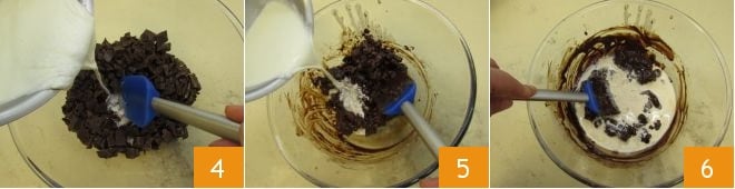 When the cream is hot, pour it over the chocolate in at least 3 additions. Pour about 1/3 of it into the bowl with the chocolate 4 and start mixing; meanwhile, keep the cream warm by placing it back on very low heat. Once the first addition of cream has been incorporated, add half of the remaining cream 5, mix (always keeping the cream warm), and once it is fully incorporated, add the last part 6. Stir vigorously until a smooth consistency is achieved.