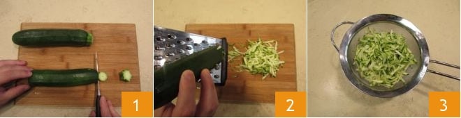 To prepare the garganelli with zucchini pesto and shrimps, start with the pesto. Wash the zucchinis, remove the ends 1, and grate them using a coarse grater 2. Then place the grated zucchinis in a strainer 3 to drain excess liquid, and lightly salt them.