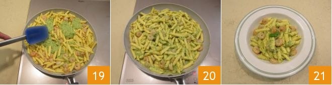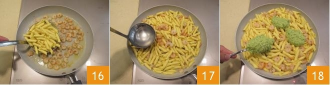 Transfer the garganelli to the pan where you cooked the shrimps 16. Cook together for a minute, add a ladle of cooking water 17, and finally, off the heat, add the zucchini pesto 18.