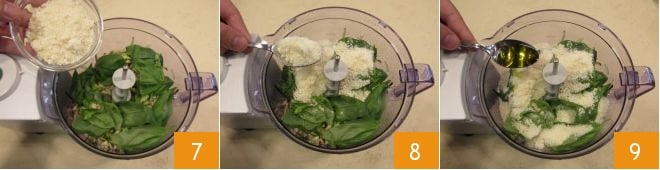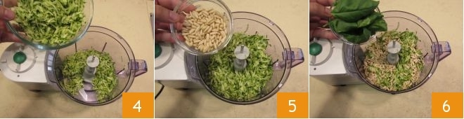 Put the zucchinis 4, pine nuts 5, and basil leaves, previously gently cleaned with a dry cloth, into the mixer 6.