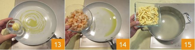 Take a non-stick pan, pour in some extra virgin olive oil, and brown the garlic clove 13. Once browned, remove the garlic and add the shrimps 14. Sauté them for about 5 minutes over medium heat until they form a crispy crust on the outside. Then bring a pot of salted water to a boil and cook the garganelli 15, draining them very al dente so you can finish cooking them in the pan with the shrimps. Keep a couple of ladles of cooking water aside.