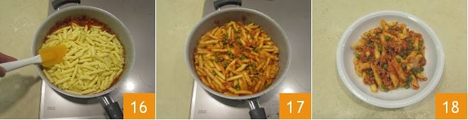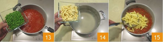 Finally, add the peas 13 and let them cook for another 10-15 minutes over moderate heat. Meanwhile, boil the pasta in a pot with plenty of salted water 14. When it is al dente, drain it with a slotted spoon directly into the pan with the sauce 15.