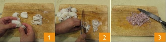 To prepare garganelli with cuttlefish and pea ragout, start by cleaning the cuttlefish by rinsing them under a stream of fresh water. Then separate the tentacles from the body 1 and finely chop both 2. Also finely chop the shallot 3.