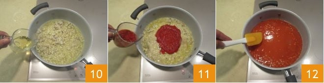 Then deglaze with white wine 10 and add the tomato puree 11. Stir the ingredients 12 and let cook for 15 minutes over moderate heat.
