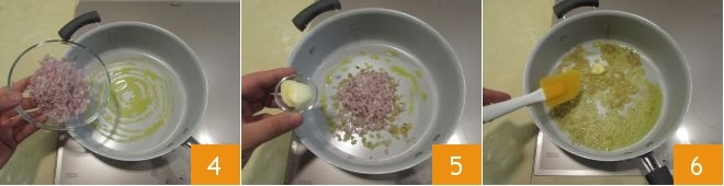 Pour the oil into a large non-stick pan, heat slightly and then add the shallot 4 and the whole peeled garlic clove 5. Stir occasionally to ensure even cooking 6.