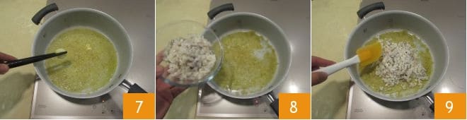 Once the shallot has softened, remove the garlic 7. Add the cuttlefish 8 and mix them to blend with the other ingredients 9. Season with salt and pepper.