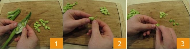 To make garganelli with fava beans and speck, start by preparing the Vegetable broth. In the meantime, proceed to clean the fava beans by shelling them 1: with the pods, you could prepare a tasty Sautéed Broad Bean Peels. Then remove the small growth above each fava bean 2 and set aside the more tender ones, while you can peel the larger ones, meaning those with a more resistant skin 3: this way, you will have the sweetest and tenderest part of the seed.