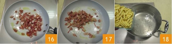 and add the speck cubes 16; let them cook on high heat for a few minutes, just enough time to make the speck crispy; stir occasionally and, when they are well browned, set them aside 17. Put a pot full of water on the stove and, when it boils, add salt. Cook the pasta halfway through 18.