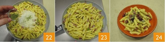 and, when the pasta is ready, turn off the heat. Sprinkle the cheese and oregano 22, mix all the ingredients 23, and finally plate the garganelli with fava beans and speck and serve them still very hot 24!
