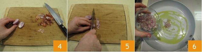 Clean the shallot 4 and finely chop it 5, then let it soften for a few minutes in a large pan with 1 ½ tbsp of oil 6.