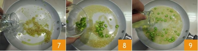 Deglaze with white wine 7 and, when the alcohol has evaporated, lower the heat and cook for 10 minutes, then add the fava beans 8; let them flavor for a moment, then pour in the vegetable broth you prepared and cook for another 15 minutes 9.