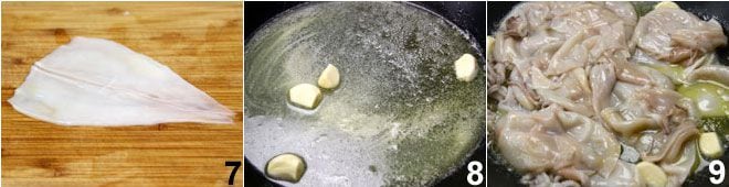 to obtain fillets 7 that will curl during cooking. Place the butter in a large pan with the oil, and once melted, add the garlic 8 and squid, frying them for a few minutes 9.