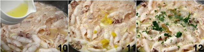Then add the wine and let it evaporate, then add the lemon juice 10 and grated zest 11, and finally the chopped parsley, salt, and pepper 12. Let it cook for a couple of minutes and then arrange everything on a serving platter, serving the garlic and lemon scented squid immediately.