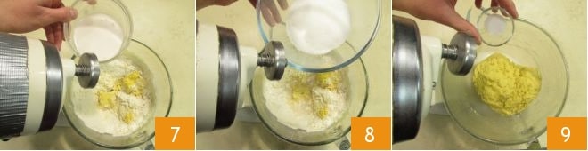 the yeast dissolved in milk 7, the sugar 8, start the mixer to coarsely mix the ingredients, then add the pinch of salt 9.