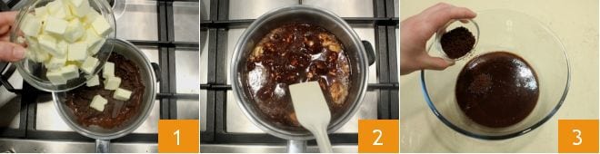 To prepare the gift packages, start with the mud cake batter: melt the dark chocolate in a bain-marie, and once it's melted, add the chopped butter 1. Stir with a spatula 2 and when the butter has melted, pour the mixture into a bowl and add the instant coffee 3.