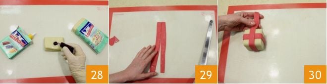Then color another block of marzipan with a few drops of food coloring to make the ribbons and colored bow: in this case, we used red coloring 28 and made two strips about 0.4 inches thick 29 to place on the packages like a ribbon 30.