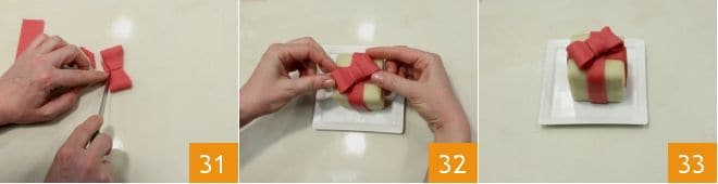 Then make a small bow with colored marzipan 31 and place it on the package at the ribbon (32-33). Create many gift packages to unwrap bite after bite!