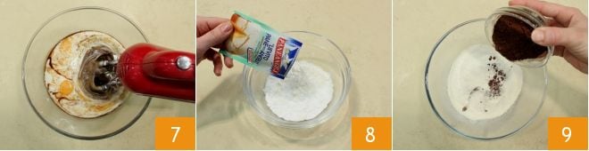 the eggs and the milk, and mix the batter with a whisk 7. In a separate bowl, pour the flour, the baking powder 8, then also add the unsweetened cocoa powder 9