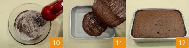 and mix the batter with the whisk 10 until you obtain a smooth and homogeneous mixture. Pour it into a greased and floured rectangular baking pan measuring 7.5x9.8 inches 11 and bake the mud cake in a preheated static oven at 356°F for 60 minutes (320°F for 50 minutes if using a fan oven). Once baked, remove it from the oven 12 and let it cool slightly before unmolding and allowing it to cool completely on a wire rack.