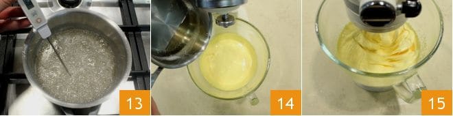 While the cake bakes, prepare the buttercream: in a saucepan, pour the water and sugar, stir and bring to a boil; use a kitchen thermometer to ensure the sugar syrup does not exceed 250°F 13. Meanwhile, in a stand mixer, beat the egg yolks (you can also use an electric mixer), add the syrup when it reaches the correct temperature 14 and continue to beat until the mixture is cool 15.