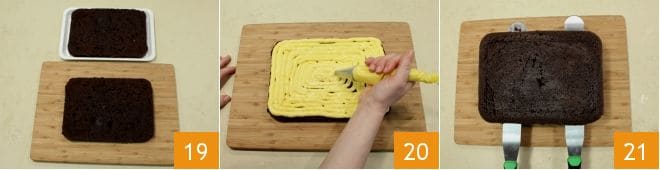 When the mud cake is completely cool, cut it into 2 layers 19 and fill the base with the buttercream placed in a pastry bag 20. Close with the other base 21,