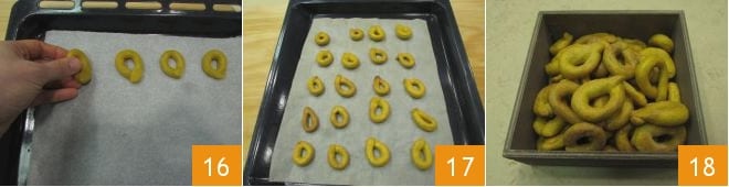 Meanwhile, preheat the oven to 392°F in static mode. At this point, transfer the boiled taralli to a baking sheet lined with parchment paper, well spaced apart 16, and bake them in the preheated oven at 392°F for about 25-30 minutes, or until they are lightly golden 17. Your ginger and turmeric taralli are ready to be crunched 18!