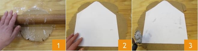 To create, bake, and assemble the house: to create the house, bake it and assemble it, you will need templates to cut the dough. For the front and back, you can cut a white sheet 8.5 inches wide and 10 inches high, with the height including the roof; for the side walls, you will need a rectangle of paper 7.5 inches long and 6 inches high; for the roof, a rectangular sheet 7.5 inches long and 5.75 inches high. For the door, you need a rectangle 4.3 inches high and 3.15 inches wide, for the windows you can use a cookie cutter 1.6 inches on each side. Take the dough, divide it into 6 parts, and roll out one part at a time into a disk about 0.6 inches thick and large enough for the part of the house you're making (you can keep the others wrapped in plastic wrap in the refrigerator while waiting to roll them out) 1. Start with the front and back: place the template on the rolled-out dough 2 and cut out the shape with a pastry wheel 3; do the same for the back.