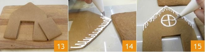 and gently remove it 13. At this point, start decorating the front with the royal icing as you prefer, retracing the roof's edge and simulating melting snow 14; also create a central window 15.