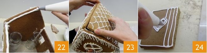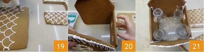 and the roof, drawing the tiles with the royal icing 19. Then generously apply royal icing to the cut sides of the front and walls, where they must fit together to build the house structure (it's advisable to assemble the house with at least two people during this assembly phase): align them so they fit together 20, and once assembled, place bottles or glass jars filled with water inside, positioning them at the corners to prevent the walls from collapsing inward 21. The icing will set and act as an adhesive between the various parts: allow 1-2 hours for it to solidify.