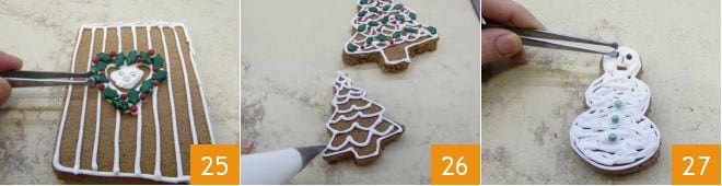 and with decorated sugar beads, you can create a heart-shaped wreath 25. Now you can focus on the other decorations: unleash your creativity and decorate the trees and the snowman with royal icing and sugar beads (26-27). By arranging the brittle around the house, you can recreate the fence, and with nougat, make the path leading to the door. With cremino chocolates, you can make the base of a bench, made with chocolate sheets, and also create the chimney. Then you can further refine the roof decorations with royal icing tufts and colored smarties. Your house is ready to be admired by your guests throughout the holiday season!